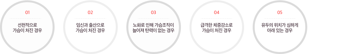 유선조직과 지방이 줄어든 경우 피부가 늘어지고탄력이 저하되면서 처진 가슴이 됩니다. 유방하수교정술은 이러한 처진 가슴을 가슴의 크기와 처진 정도를 판단하여 가슴 모양과 유두의 위치를 교정해주는 수술입니다.