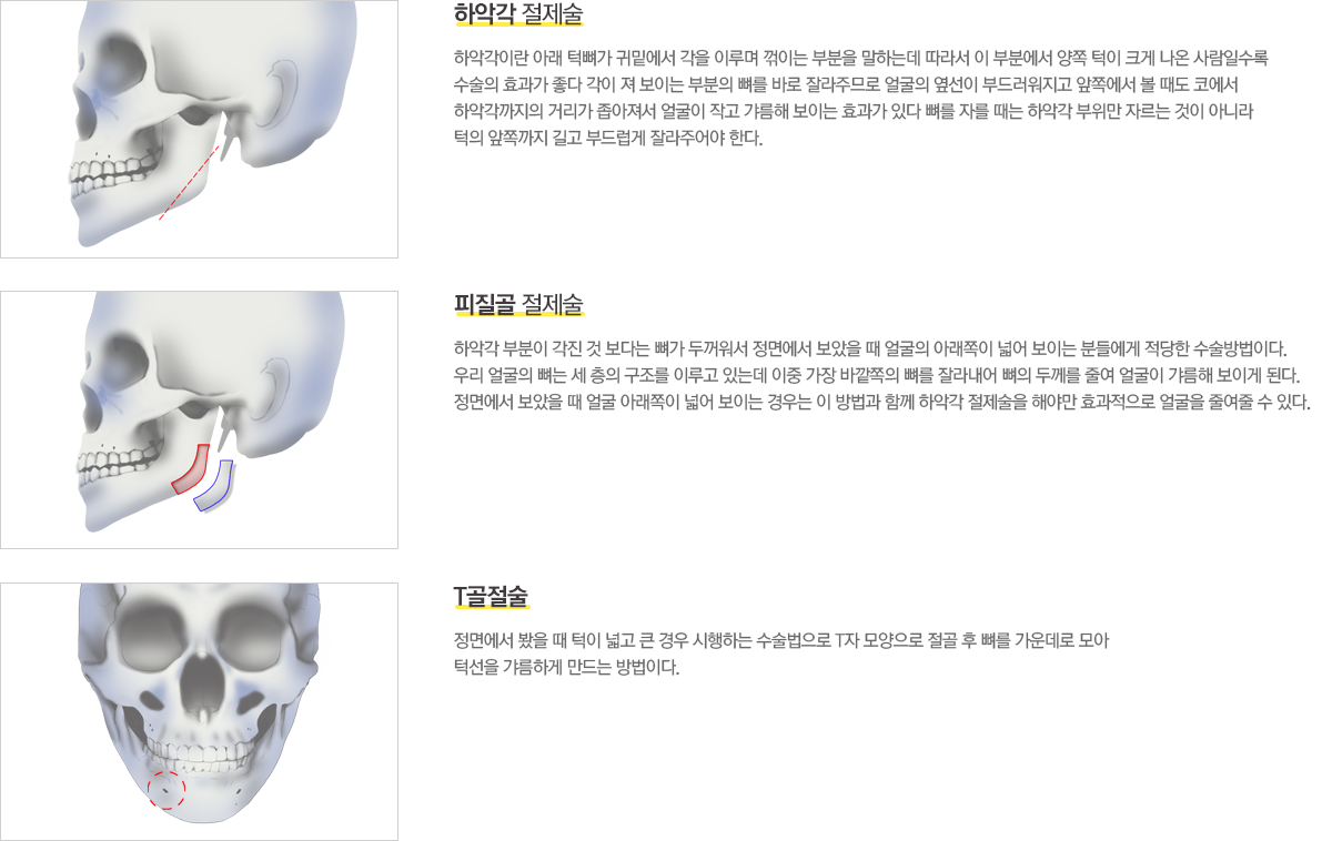 사각턱 교정은 입안 점막을 절개해 양 옆의 각진 턱을 깎아 낼 뿐만 아니라 그 주변 부위까지 곡선을 맞추어 얼굴형을 다듬어 주는 수술입니다. 기존 사각턱수술의 경우 양옆 턱이 넓고 앞턱이 작은 경우 많은 효과를 볼 수 있으나 골격자체가 넓고 광대나 양옆턱 그리고 앞턱이 발달한 경우 곽대뼈 축소술+사각턱과 앞턱라인을 연결하여 V자 모양으로 깎아내는 수술로 더 작고 완벽한 브이라인 얼굴을 만들 수 있습니다.