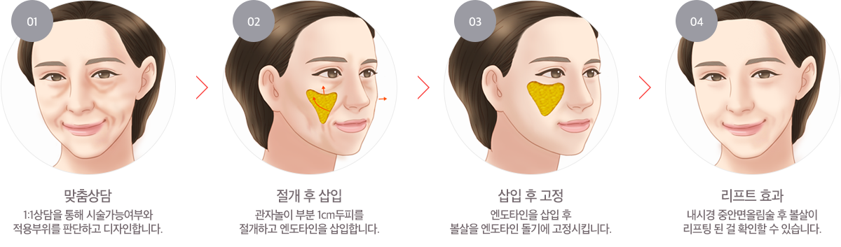 눈과 입사이를 얼굴 중간부위라고 합니다. 근육의 수축, 생활습관 그리고 유전적인 영향으로 인해 이 부분이 아래쪽으로 처지게 됩니다. 이진성형외과 내시경 중안면올림술은 엔도타인을 이용하여 축 처진 볼살을 젊어보이는 위치와 볼륨으로 변화시켜 젊고 생기 있어 보이게 하는 수술입니다.